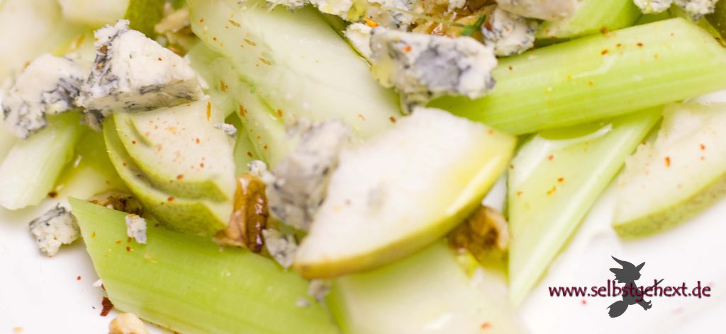 Birnen, Stangensellerie, Blauschimmelkäse (Bavaria blu), Walnüsse und essbare Blüten – soooo lecker!