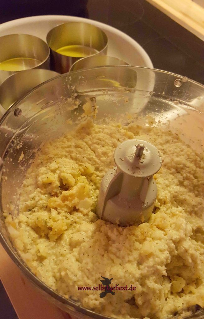 Einen Blumenkohlkopf in kochendem Salzwasser weich kochen und grob stampfen. 100 Gramm Käse in kleine Stückchen schneiden, ich habe Reste vom Emmentaler genommen.