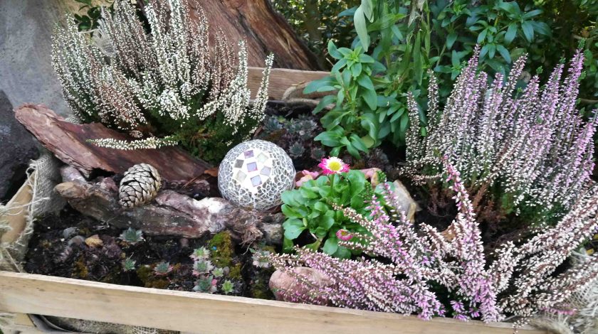 Alles Reste oder was? Ja, genau. Eine ausgediente Obststeige, ein zerlumpter Jutesack, Rinde, Totholz … Dazu kommen Reste von typischen saisonalen Topfpflanzen wie Heide, Gänseblümchen oder auch Hauswurz. Dazu ein paar dekorative Steine und eine Rosenkugel. Upcycling funktioniert auch im Garten.weiterlesen