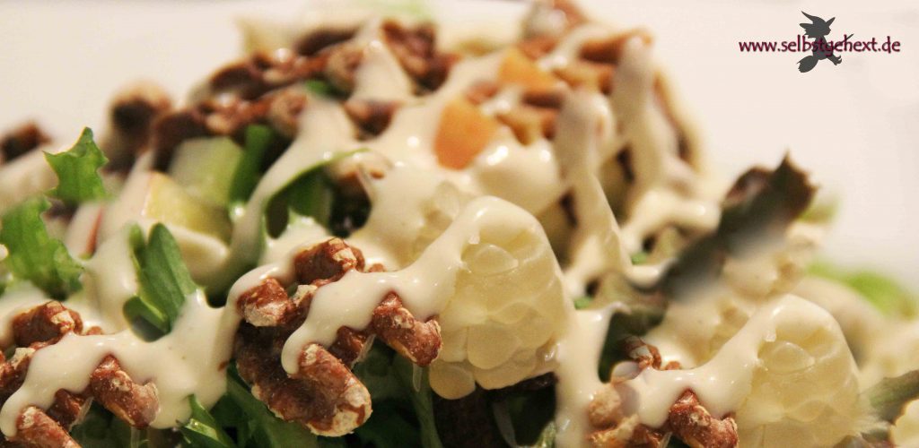 Eichblattsalat mit Pomelo und Walnüssen dazu ein leichtes Salatsößchen.