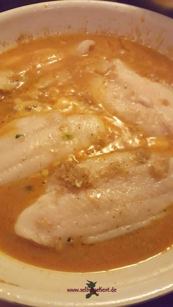 Pangasius in zitronig-fruchtiger Senfsauce dazu gibt’s den restlichen Reis von gestern.