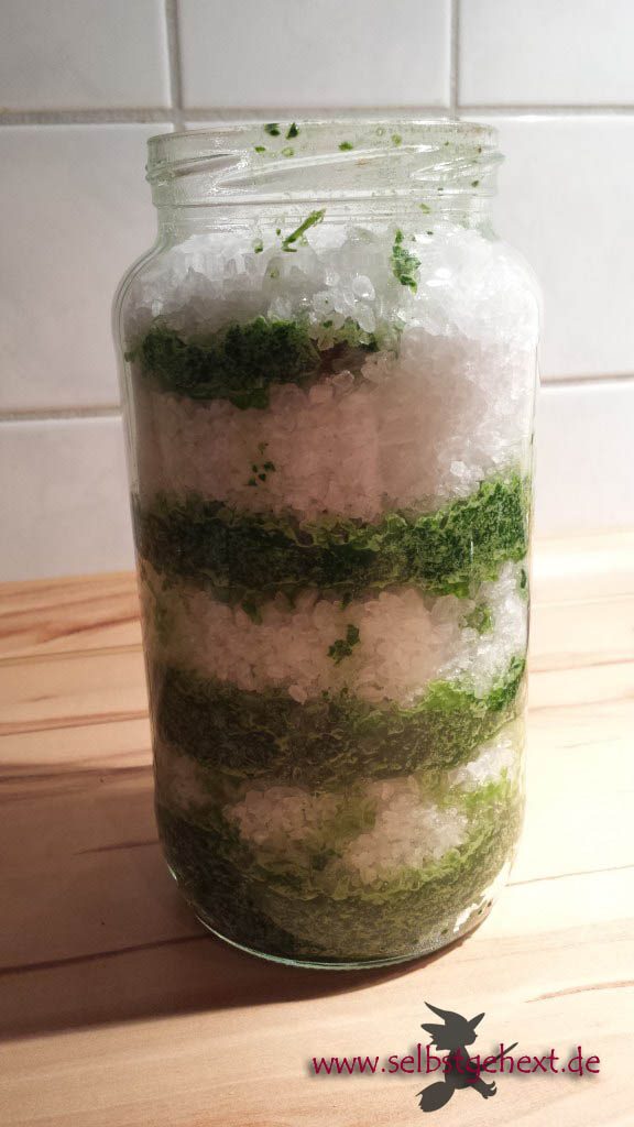 Kräuter wie Giersch, Gundermann, Brennnesseln, Taubnesseln, Vogelmiere, Wegerich, Wiesenbärenklau, Ringelblumen, Malvenblüten und/oder Klee zermatschen und in einem großen Glas mit grobem Meersalz oder Steinsalz aufschichten.