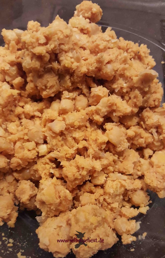 150 Gramm getrocknete Kichererbsen (oder 1 große Dose) über Nacht einweichen. Im Einweichwasser aufkochen und etwa eine Stunde bei niedriger Hitze köcheln lassen. 1 Knoblauchzehe und 1 kleine Zwiebel hacken und dazugeben. Ebenso 1 guten Spritzer Zitronensaft, 2 EL Olivenöl und bei Bedarf noch etwas Wasser hinzugeben und durchmüllern.