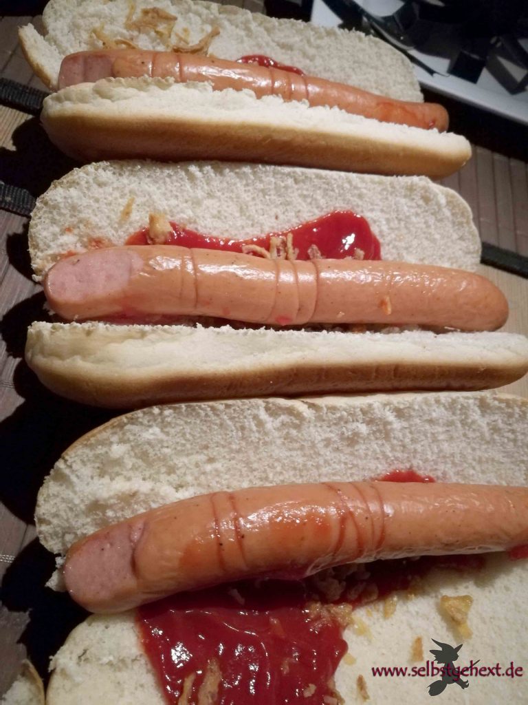 Bis auf die Röstzwiebeln und das Ketchup ist hier, zugegeben, alles gekauft. Doch brauchte es außerdem lediglich Hotdog-Brötchen und Würstchen.
