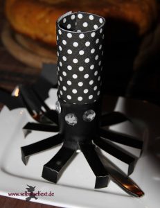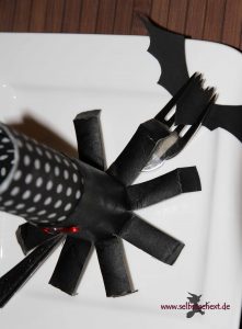 Okay, irgendwas ist bei diesem Bild schief gelaufen, aber die Idee ist es die zählt. Aus Pappe einfach kleine Fledermäuse ausschneiden und diese in die Gabeln klemmen. Die eignen sich somit auch als Namensschilder.