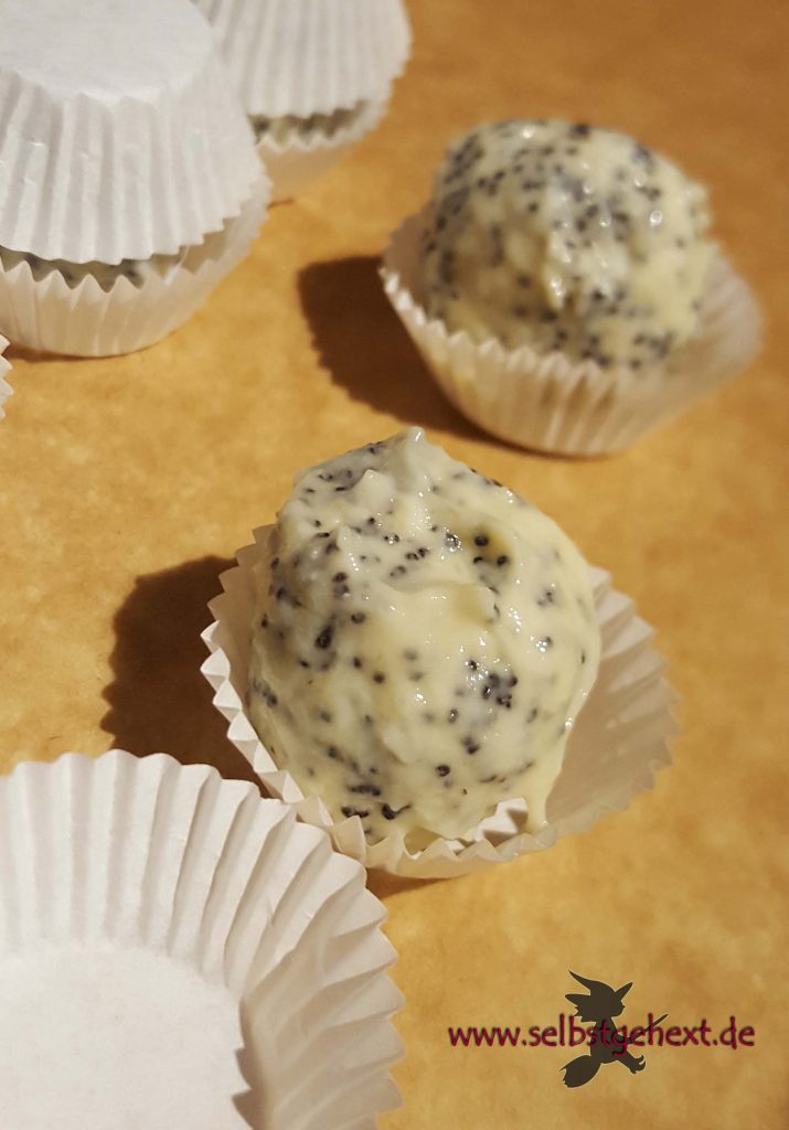 - Mohnback und geschmolzene Schokomasse vermengen und für etwa eine Stunde kalt stellen. Nun müsste die Masse sich noch gut mit den Händen zu mundgerechten Bällchen formen lassen. Oder ihr befüllt damit Silikonformen. Nochmals kaltstellen.