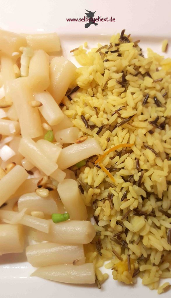 Wildreis mit Fruchtfleisch, Saft und Zesten einer Orange kochen.