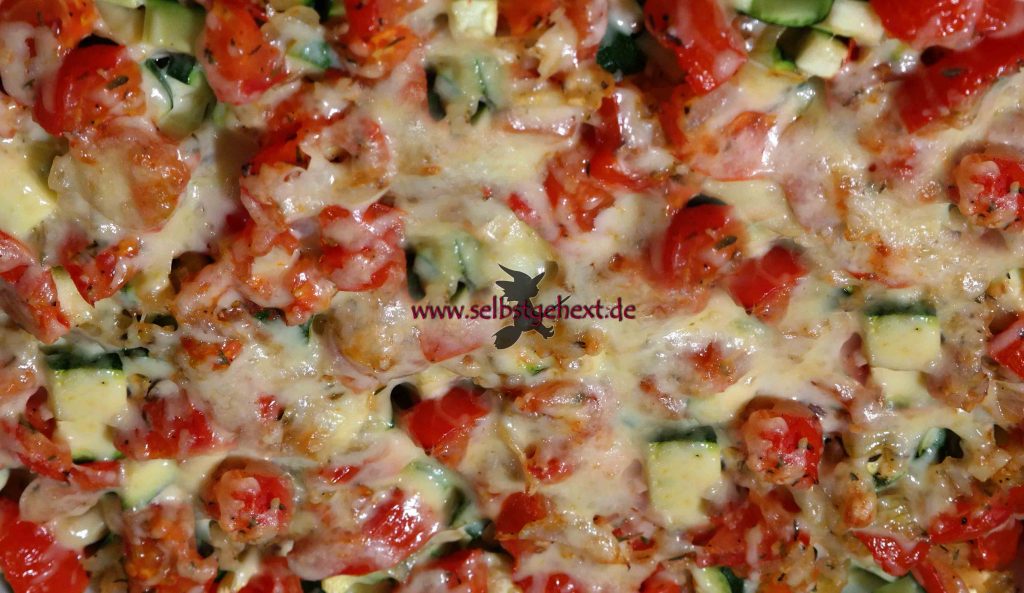2 große Zucchini, 1 rote Paprikaschote, 1 gelbe Paprikaschote und 3 große Tomaten in mundgerechte Stücke schneiden. Mit 2 EL Olivenöl, 5 EL Tomatenmark, 3 EL fein gehackte Kräuter (z.B. Rosmarin, Basilikum, Thymian oder Salbei), 1 Prise Zucker und frisch gemahlener schwarzer Pfeffer vermengen. Aubergine nicht vergessen!