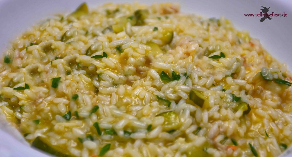 In einem zweiten Topf die Zwiebeln und den Knobi in 6 EL Olivenöl glasig brutzeln. Gurkenfleisch und 500 Gramm Risotto-Reis (oder einfach Milchreis) dazu geben und gemeinsam 5 Minuten dünsten. Gurkenschalen aus der Gemüsebrühe fischen und unter Rühren zum Reis geben. Deckel drauf und etwa 20 Minuten leise köcheln lassen.