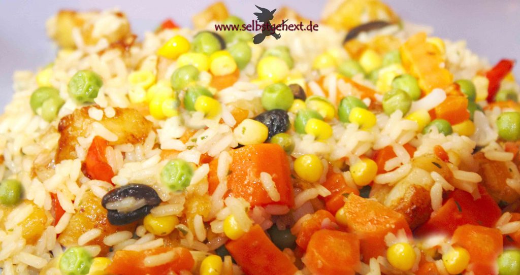 Sommerrisotto: Reis, Möhren, Erbsen, Mais, Tomaten, Paprika, Oliven und Kräuter