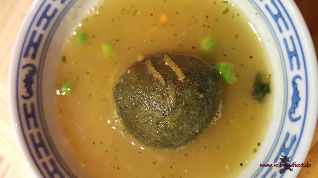 Alles vermengen und mit der Hand die Knödel formen. Ich habe sie in einer ungefetteten Pfanne gleichmäßig von allen Seiten angebraten, um sie dann in der heißen Suppe zu platzieren.
