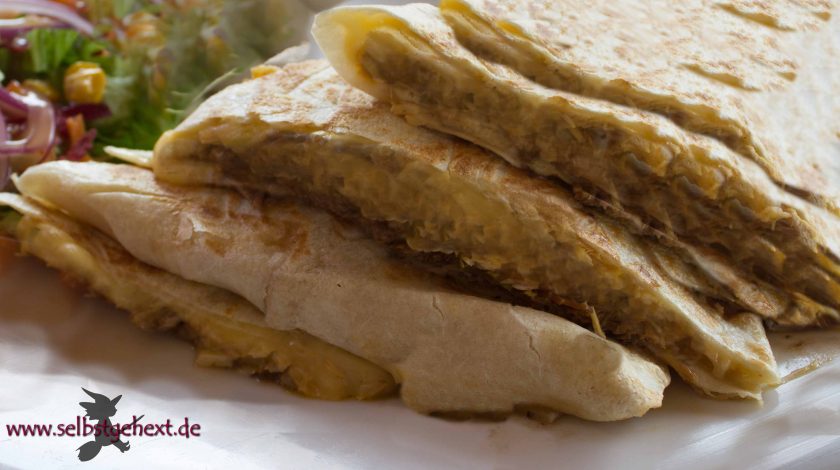 12 Tortillas (gekauft oder selbstgehext) erwärmen. Wenn sie weich werden, zur Hälfte zusammenfalten. Hälfte mit der Masse füllen.