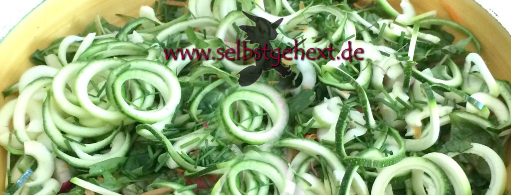 1 kleine, junge Zucchini im Spiralschneider zu Zucchininudeln verarbeiten. Mit 0,5 TL Salz bedecken und gut 20 Minuten stehen lassen. Wasser abschütten.
