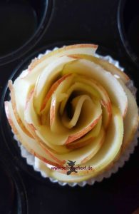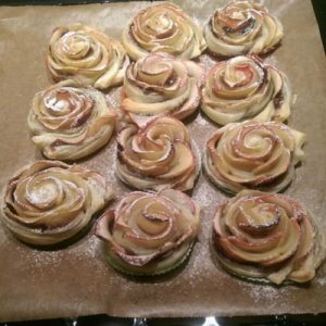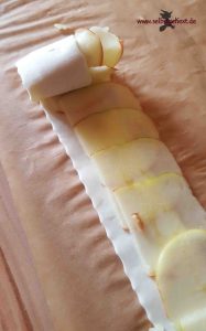 Kleine Apfelscheiben nach links, größere nach rechts auf den Blätterteigstreifen fächerartig platzieren – und dann von links nach rechts aufrollen und leicht andrücken.