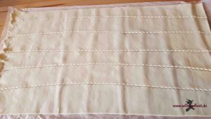 Eine Packung backfertigen Blätterteig (oder selbermachen) in sechs Längsstreifen (jeweils etwa vier Zentimeter breit) schneiden und mit Zimt bestreuen.