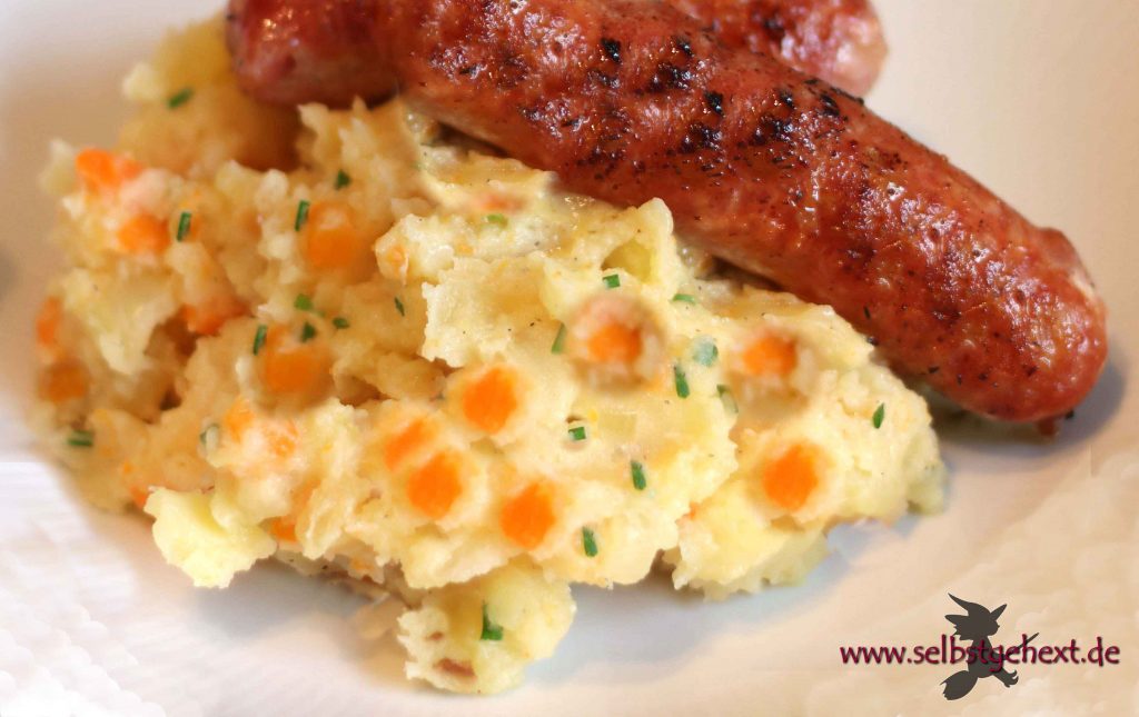 „Bangers and mash“ klingt doch irgendwie besser als Kartoffelbrei und Würstchen, oder? Naja, genauer ist es Kartoffelselleriestampf mit Karottenwürfeln an stinknormalen Bratwürstchen. Trotz schnödem Namen sehr lecker!
