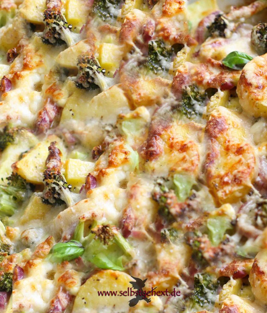 Gratinform einfetten. Brokkoli hineingeben. Aus 2 Eiern, etwas geriebene Muskatnuss, Salz und Pfeffer, 1 Becher Saure Sahne, 1 Schwapp Milch, 1 TL Speisestärke und 100 Gramm geriebenem Käse (z.B. Gruyère) einen Guss zaubern und diesen über den Brokkoli schütten.
