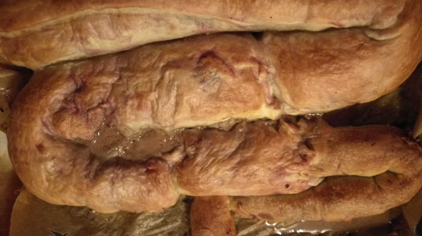 Sieht widerlich aus, schmeckt aber richtig gut. 2 Rollen Blätterteig (der in Blechgröße) auslegen, nach Wunsch füllen und zu einer großen Wurst formen, die zum Ende hin schmaler wird. Unser Dickdarm war mit Hack und Lauch gefüllt, unser Dünndarm mit Gemüse-Frischkäse-Füllung. Mehr Halloween?weiterlesen