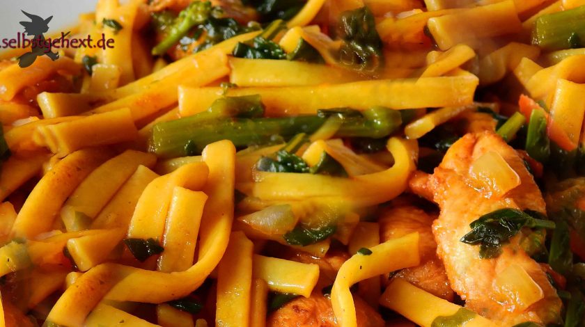 Blätter und den oberen, nicht verholzten Teil von zwei Stangensellerie in mundgerechte Stücke schneiden. Hähnchenbrustfiletstücke portionieren. Gemeinsam mit einer fein gewürfelten Zwiebel anbraten. Sellerie hinzugeben und alles vermengen. Mit etwas Tomatenmark und Gemüsebrühe ablöschen und köcheln lassen. Bandnudeln oder ähnliches kochen. In die Pfanne dazugeben und unterheben. Fertig. Lecker. 😉 Merken Merken Merkenweiterlesen