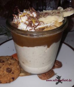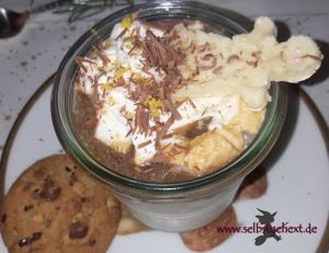 Erst die Mousse in ein Glas oder in ein Schälchen, dann die Soße drüber fließen lassen. Mit weiteren zerbröselten Cookies, Schokolade oder Cranberrys garnieren.