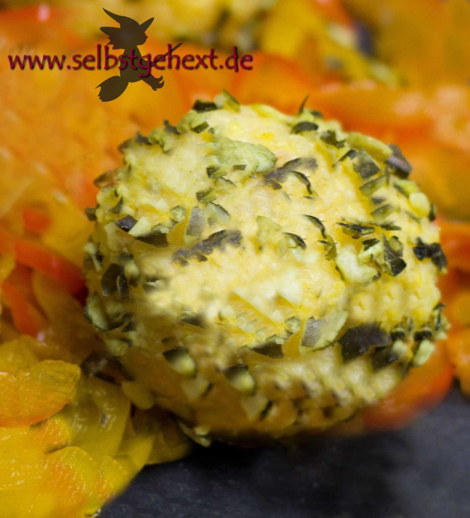 150 Gramm Frischkäse (oder Ziegenfrischkäse oder eine 1:1-Mischung aus beidem), Salz und Pfeffer mit 1 TL Zitronensaft vermengen und in 5 EL gehackten Kräutern (hier: Radieschenblätter) wälzen. Kühl aufbewahren.