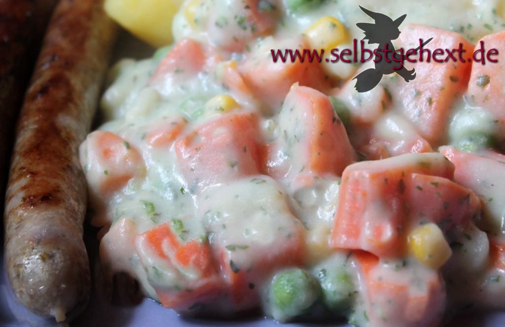 Aus 1 EL Butter, 2 TL Mehl und 250 ml Milch eine Einbrennsoße kochen und feingehackte Kräuter dazugeben. Über das Gemüse geben, umrühren, fertig.