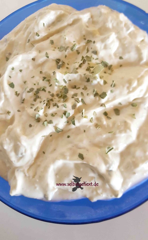 8 Minzzweige sauber schütteln und entblättern. Blätter fein hacken und in 100 Gramm Magerquark rühren. Wenn es nicht cremig genug ist, einfach 2 EL Milch hinzugeben. Mit Salz und Pfeffer abschmecken. Bei Bedarf passen 2 fein gehackte, frische Korianderzweige perfekt dazu.