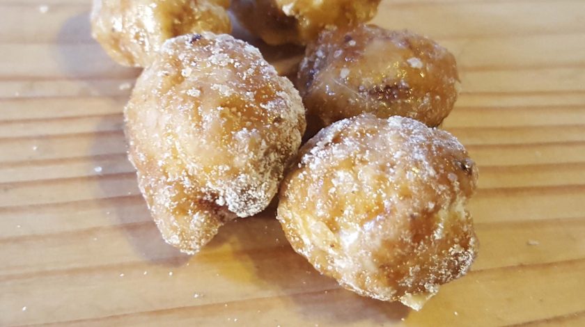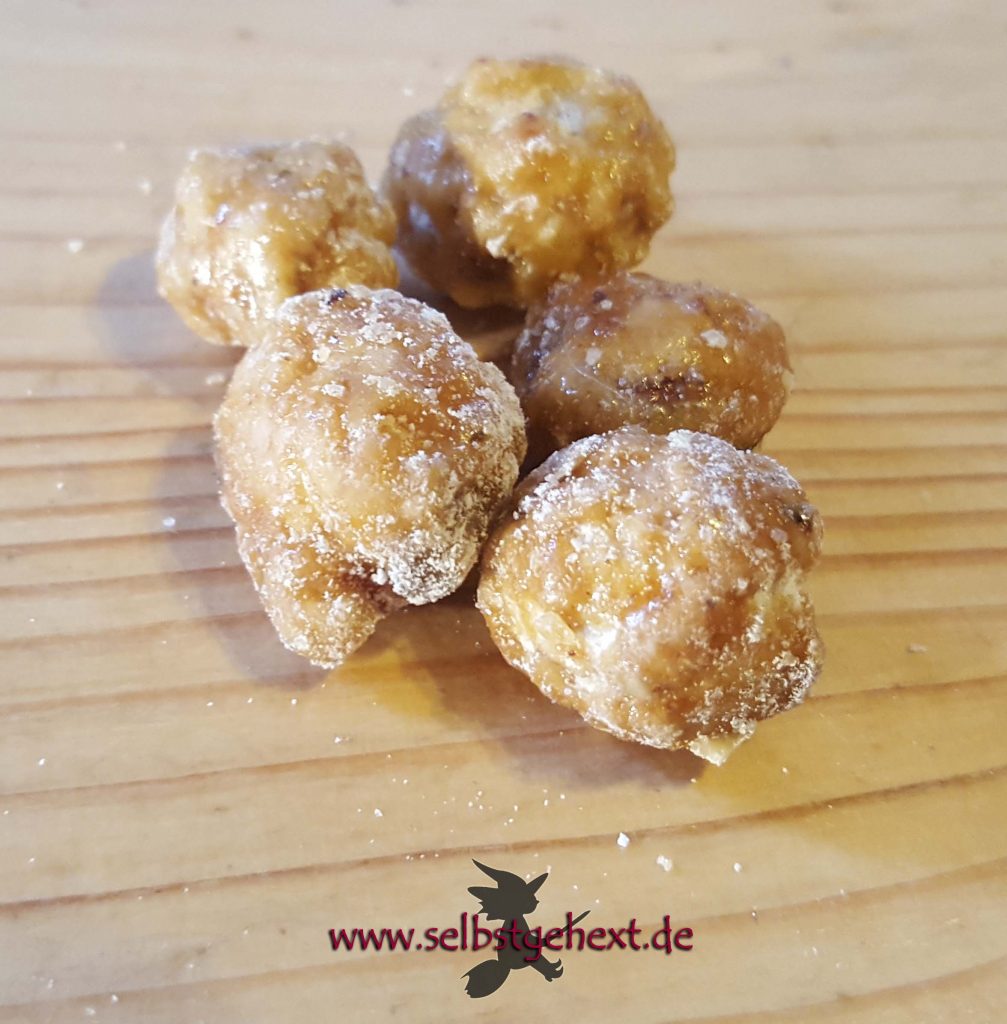 200 Gramm Makadamia in einer Pfanne leicht rösten und mit 2 EL Zucker und 2 EL Butter karamellisieren. Auf einem Teller Puderzucker mit Zimt vermengen. Die Nüsse noch warm darin wälzen.