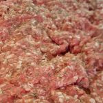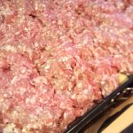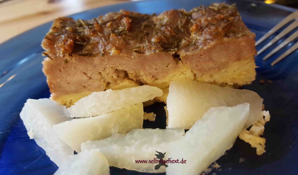1 Kilo Hackfleisch mit 1 feingewürfelten Gemüsezwiebel, Salz und Pfeffer vermengen und auf den Brotwürfeln platt drücken (Bild 3).