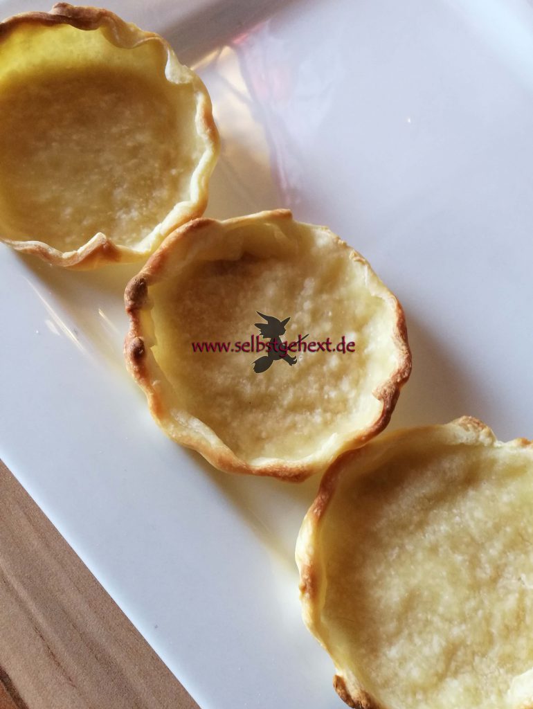 Herzhaften Mürbeteig zubereiten und in Tartelett-Förmchen blindbacken. Abkühlen lassen. Pesto aus dem Keller holen. Knoblauch in dünnen Scheiben hobeln, oder wem das zu heftig ist, je zwei „Scheiben“ gehobelter Nüsse nutzen.