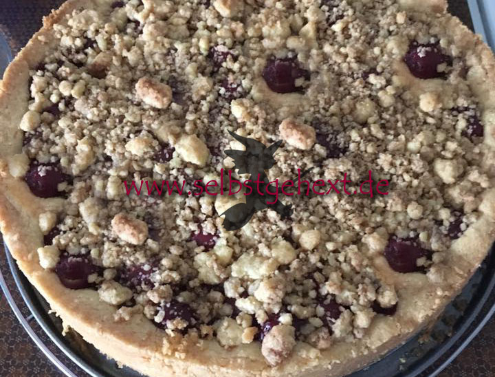 Kirschen dazu und aus 80 Gramm kalter Butter, 150 Gramm Mehl, 1 Prise Salz und 150 Gramm Rohrohrzucker Streusel kneten.