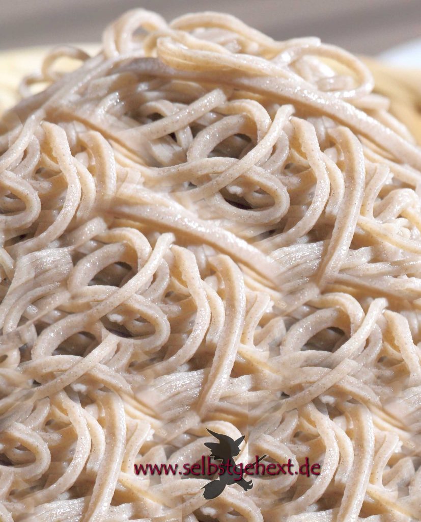 Maronenfleisch noch heiß zerstampfen. 80 ml Milch, Mark einer halben Vanilleschote und 40 Gramm Puderzucker unterheben. Das Püree durch einen Fleischwolf oder eine Spätzlepresse auf die Teller drücken. Dekorieren kann man es mit Kirschsoße und weißer geraspelter Schokolade. Eben genau wie Spaghetti mit Tomatensoße und Parmesan. 😉