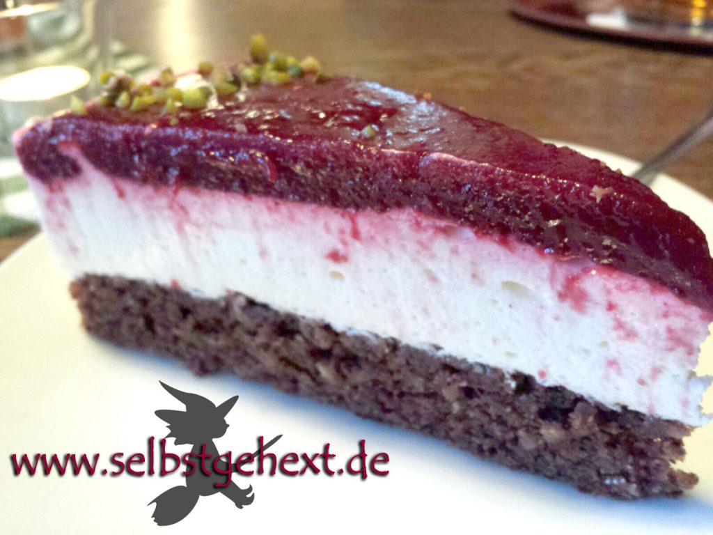 400 Gramm Sauerkirschen entkernen und abtropfen lassen, aber den Saft unbedingt auffangen. 3 EL Speisestärke mit 2 TL Rohrohrzucker und 3 TL Zitronensaft anrühren. Kirschsaft zum Kochen bringen, angerührte Stärkemischung einrühren und kurz aufkochen lassen. Kirschen hinzufügen, alles pürieren und etwas abkühlen lassen. Auf der Sahneschicht glattstreichen.