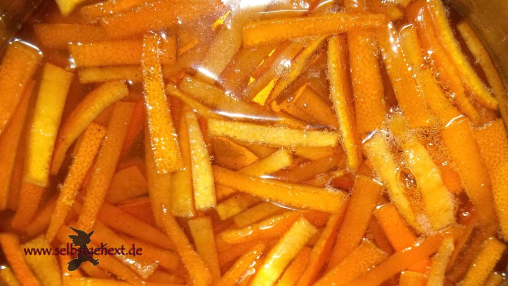 Bio-Früchte gründlich waschen. Schalen vom Fruchtfleisch trennen und dann diese Schalen auch von der innenliegenden, weißen Haut befreien. Oder mit dem Sparschäler und etwas mehr Kraftaufwand arbeiten. Sonst wird’s bitter. Am besten klappt das, in dem die Schale in dünne Längsstreifen geschnitten wird. Diese Streifen oder Zesten werden in Würfel geschnitten.