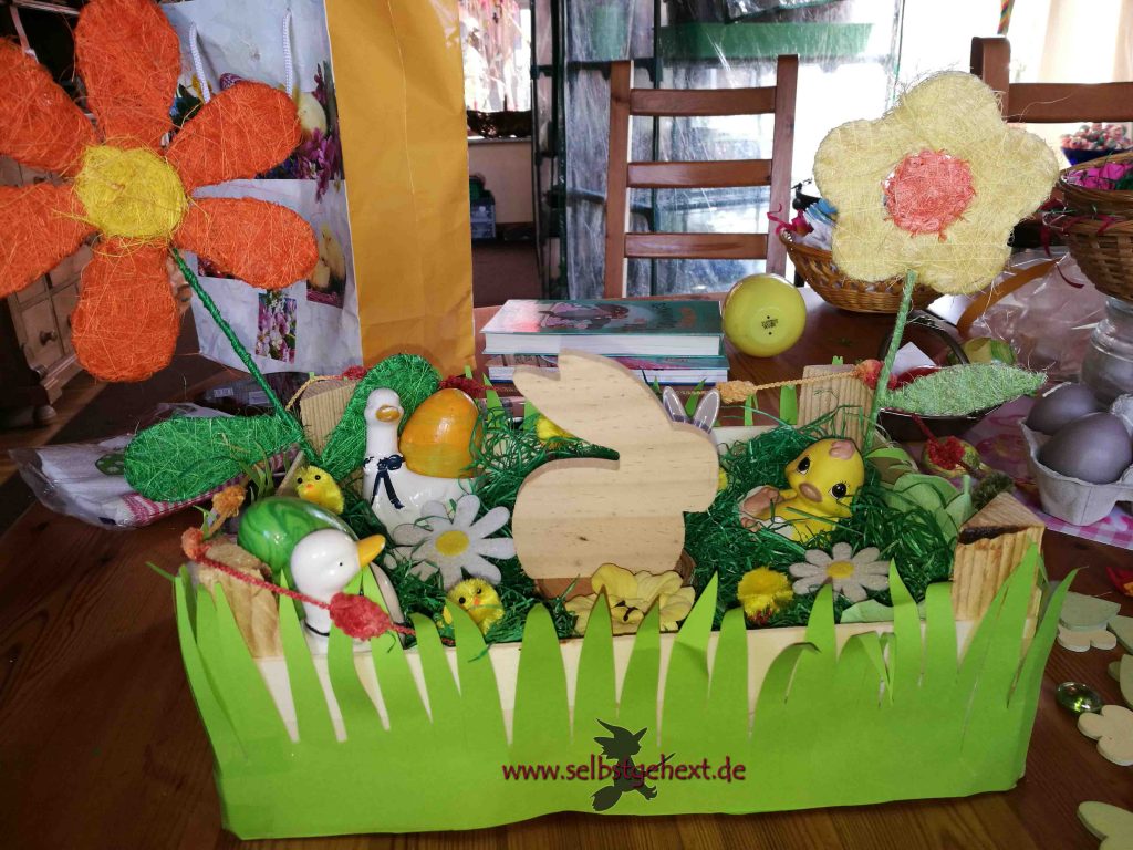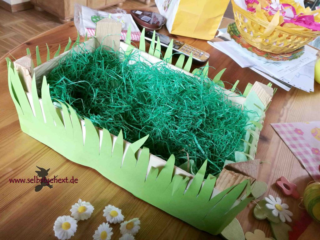 Einfach aus grünem Kartonpapier ein Grasmuster ausschneiden und ringsherum aufkleben. Auch hier darf sich füllungstechnisch ausgetobt werden. Ich habe einfach alles auf das (uralte) Papiergras platziert, was nicht zur restlichen Deko auf Tischen und Fensterbänken passte.