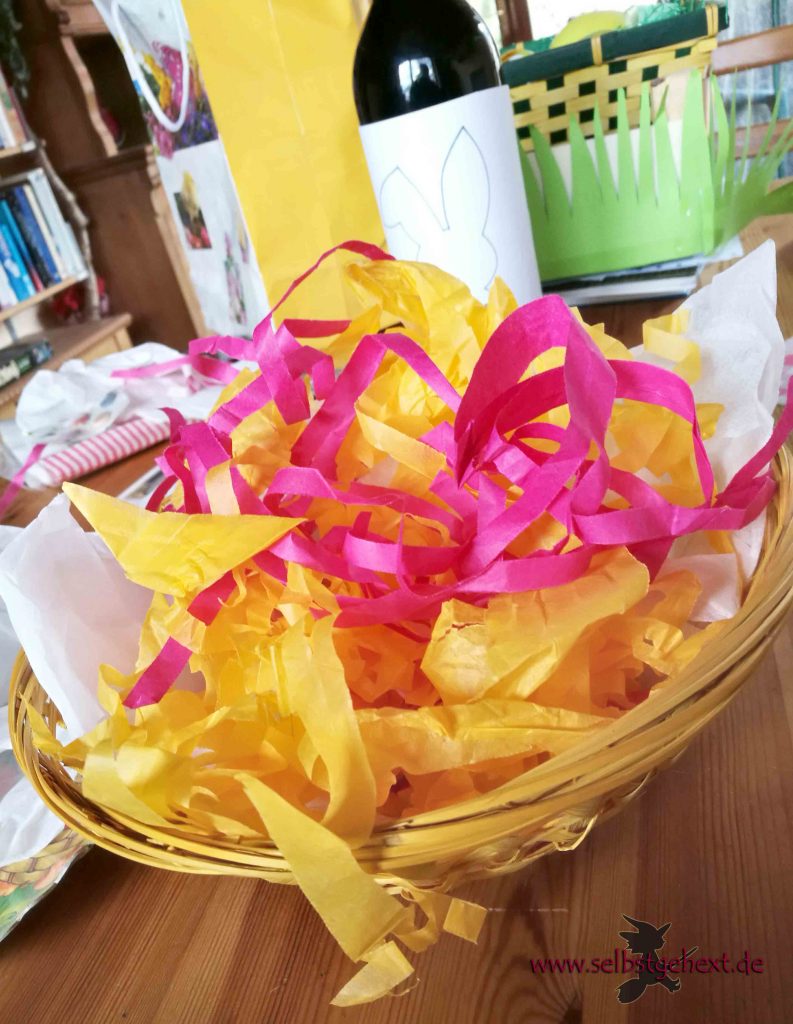 Was soll’s der vielen Worte? Bei meinem Osterbasteln geht es eigentlich nur darum, Reste zu verarbeiten. Hier kommen Überbleibsel von Servietten, Geschenkpapier oder Geschenkbändern zum Einsatz. Der Fantasie bei der Füllung eines Osternestes ist keine Grenze gesetzt. Irgendwo habe ich auch noch (unbenutzte) bedruckte Taschentücher herumfliegen.