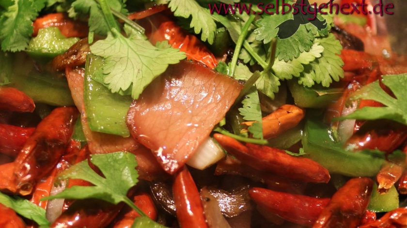 Ein Gang durch den Garten und einfach alles einsammeln, was scharf ist: Chili, Koriander, Kresse, Petersilie, Paprika in grün und rot, Zwiebeln, Knoblauch. Einmal mit etwas Olivenöl durch die Küchenmaschine und dann in kleine Gläser füllen.
