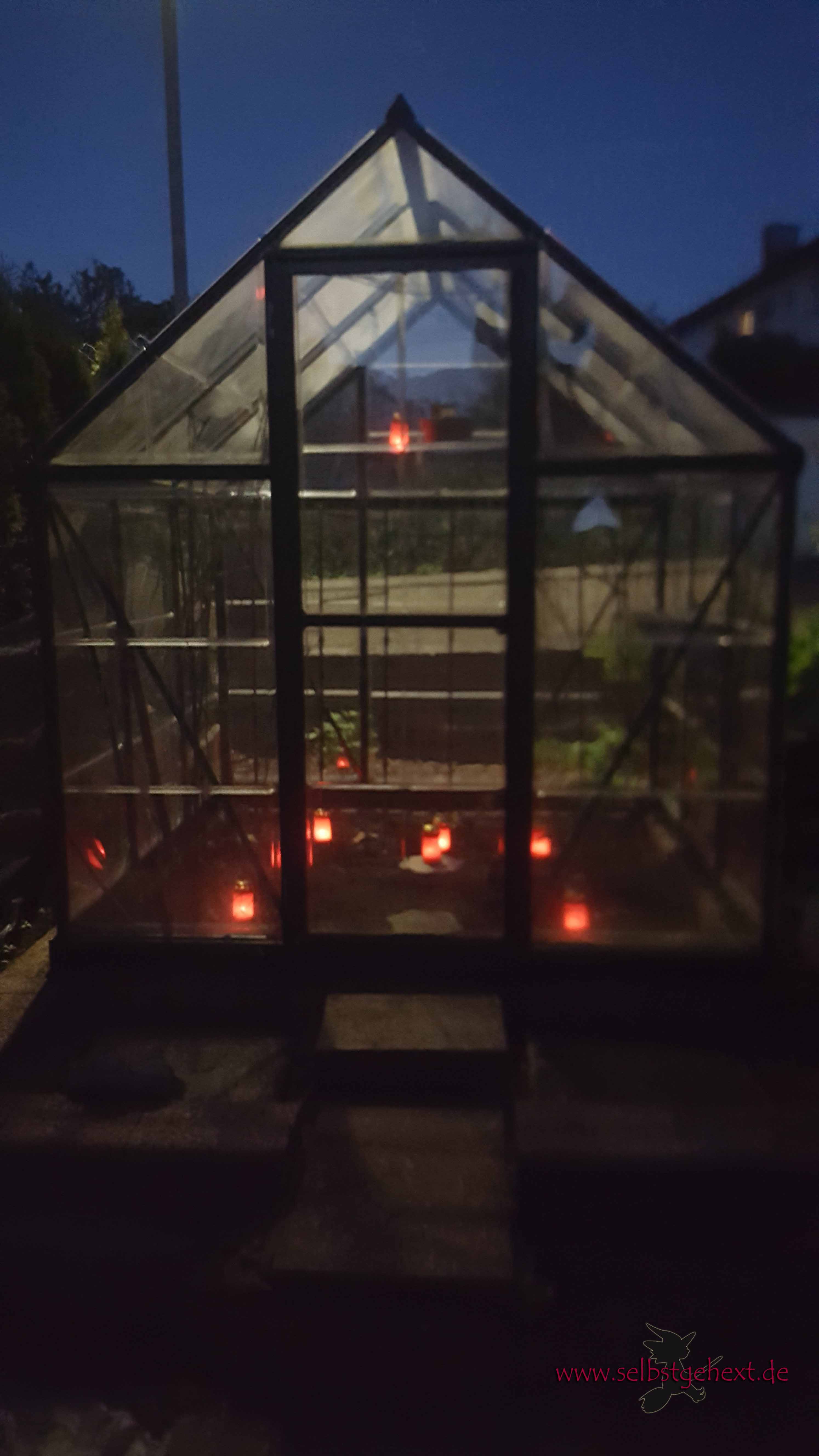 Wenn die jungen Pflänzchen im Gewächshaus nachts eine warme Decke brauchen: Friedhofskerzen. Ein fast romantischer Lichteffekt inklusive. 😉