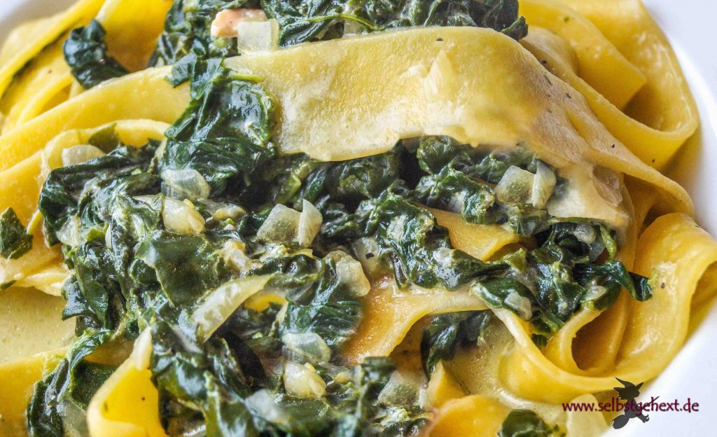 300 Gramm Mehl, 3 Eier, 0,5 TL Salz und 2 EL Olivenöl vermengen bis er sich leicht löst und glänzt. Teig zu einer Kugel formen und im Kühlschrank für eine Stunde ruhen lassen. Teig auf einer bemehlten Arbeitsfläche dünn ausrollen und schneiden die Bandnudeln mit einem Teigmesser abrollen. In gesalzenes, kochendes Wasser geben. Nach drei bis fünf Minuten sind die Nudeln gar. Abhängig von Mehlart und Eiergröße muss man sich etwas an die perfekte Mischung heranprobieren.