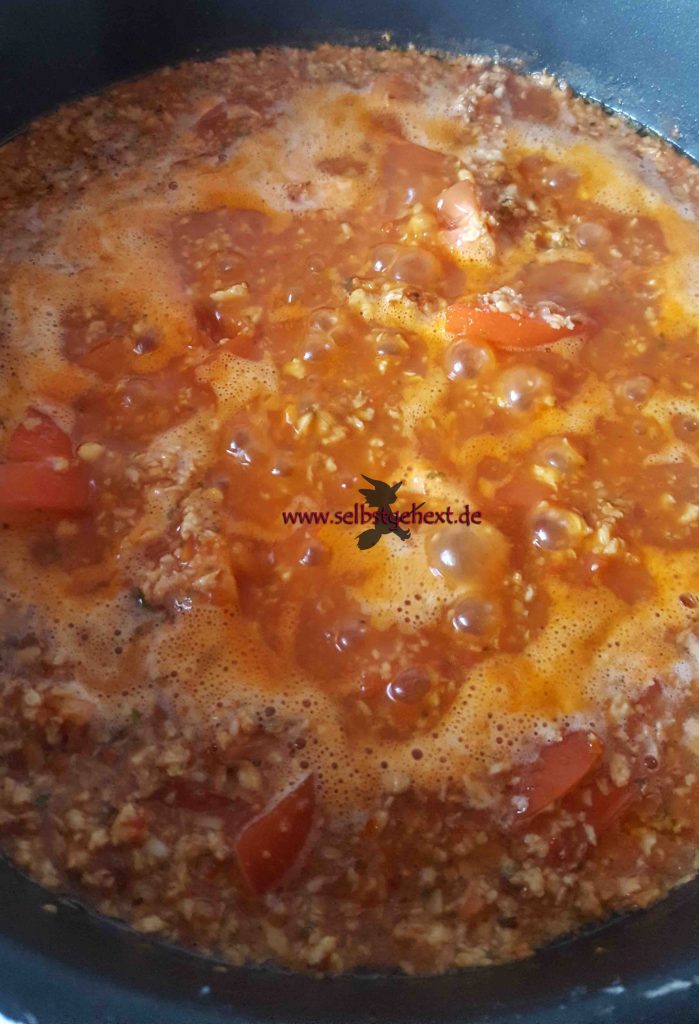 300 Gramm Sellerie und 300 Gramm Karotten würfeln und dazu geben, kurz und hart anbraten. Mit 300 ml angerührter Gemüsebrühe ablöschen und etwa fünf Minuten köcheln lassen. Wenn das Gemüse fast gar ist, das Sojagranulat und 400 Gramm passierte oder klein gewürfelte Tomaten beimengen. Mit mediterranen Gewürzen (oder etwa 2 EL Soffritto) abschmecken, eine viertel Stunde köcheln ziehen lassen.