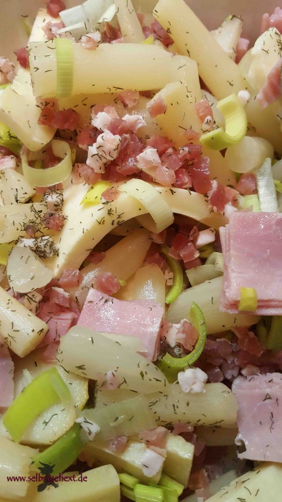 Glas auf, in die Form, Lauch säubern und schnippeln, Schinkenwürfel und Käsereste dazu und alles, was man loswerden muss.