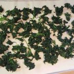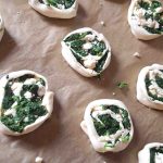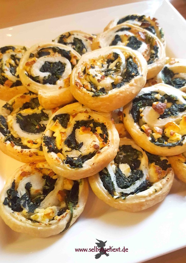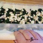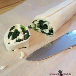 1 Rolle Fertig-Blätterteig (oder selberhexen) auftauen lassen und auf Backpapier ausrollen. 1 Zwiebel fein würfeln und in 1 EL Öl glasig dünsten. 200 Gramm Spinat ernten, säubern und zu der Zwiebel dazu geben. Mit 100 ml Gemüsebrühe ablöschen und alles kurz köcheln lassen. Über ein Sieb abschütten, abkühlen lassen und das Gemüse etwas ausdrücken. Auseinandergezupft auf dem Blätterteig verteilen.
