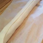 Mit Hilfe des Backpapiers zu einer festen Rolle zusammenrollen und in daumendicke Scheiben schneiden. Diese auf ein Backblech setzen, etwas zurecht formen und kurz gehen lassen. In der Zeit den Backofen auf 180 Grad Umluft vorheizen.