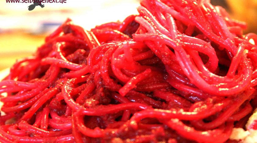 In einem kleinen Topf mit etwas Wasser 3 oder mehr ganze Rote-Bete-Knollen für 10 Minuten kochen. Rausnehmen und etwas abkühlen lassen. Dann schälen, entstielen, raspeln und austretenden Saft auffangen. Raspeln und Saft mit etwa 1,2 Liter Wasser (wenn nötig mehr), 1 EL Salz, 200 ml Sahne und etwas Zitronensaft zum Kochen bringen. 500 Gramm Nudeln darin bissfest kochen. Mit 1 EL Butter, 100 Gramm geriebenem Hartkäse und Pfeffer aus der Mühle abschmecken. Merken Merkenweiterlesen