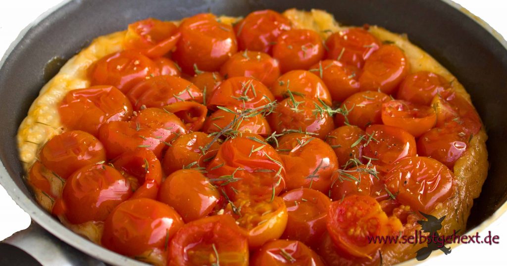 Ein Viertel des Teiges in eine leicht geölte 26er-Pfanne geben. Nach etwa drei Minuten. Hitze sofort runter drehen und mit den Tomaten belegen. Frischen Pfeffer und frischen Thymian über die Pizza geben.