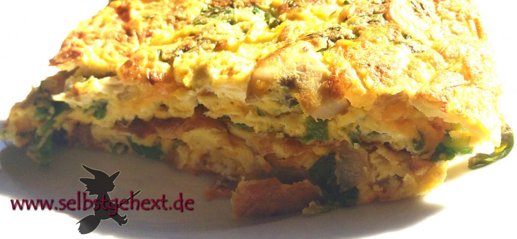 1 Zwiebel in einer Pfanne in etwas Öl anbraten 3 Hände voll frisches Unkraut (z.B. Giersch, funktioniert aber auch mit Spinat) dazu geben und blanchieren. In der Zeit 4 Eier mit 100 ml Sahne, Salz und Pfeffer und frischen, gehackten Kräutern verquirlen. Eimasse über das Grünzeug gießen. Anbraten und dann – bei ausgeschaltetem Herd – noch auf der Platte stehen lassen.