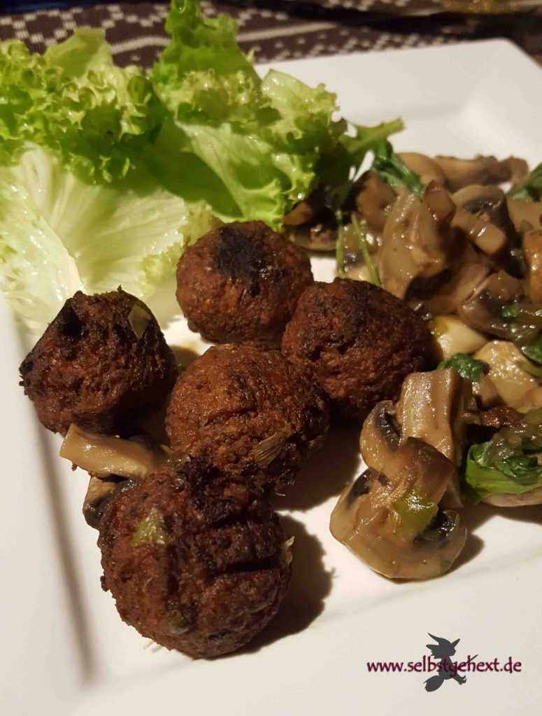 Falafel mit Pilz-Rucola-Gemüse 800 Gramm Kichererbsen, 24 Stunden eingeweicht und sehr fein gehackt