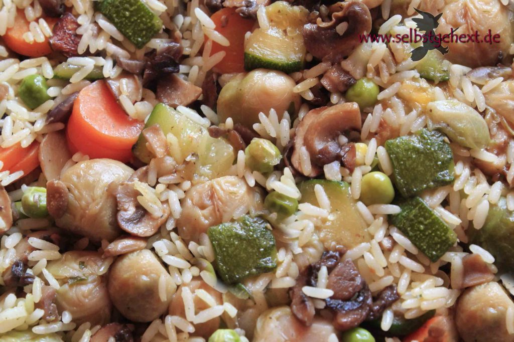 Veganer Herbsteintopf mit Pilzen, dazu Reis von gestern