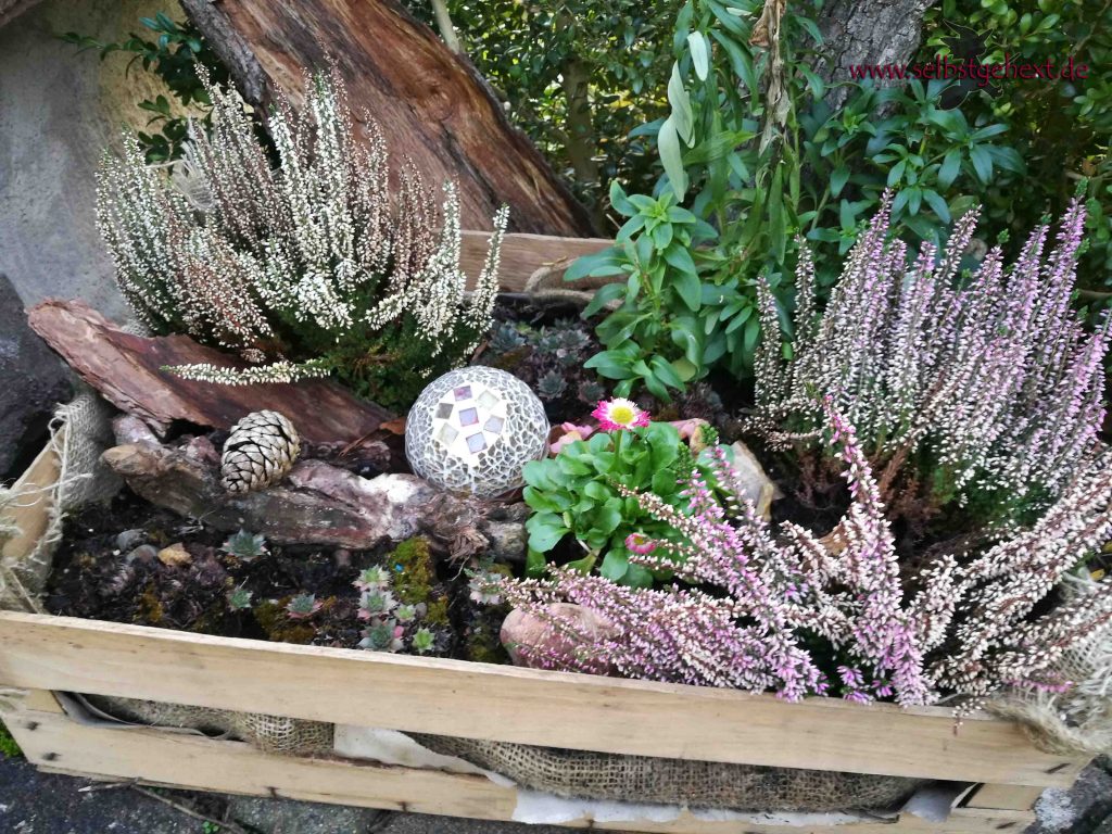 Dazu kommen Reste von typischen saisonalen Topfpflanzen wie Heide, Gänseblümchen oder auch Hauswurz. Dazu ein paar dekorative Steine und eine Rosenkugel.