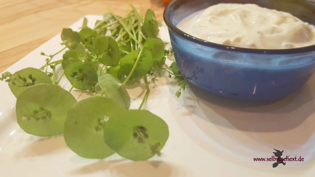 Winterportulaksalat dazu Ofenkartoffeln, mit leichtem Joghurt-Dip
